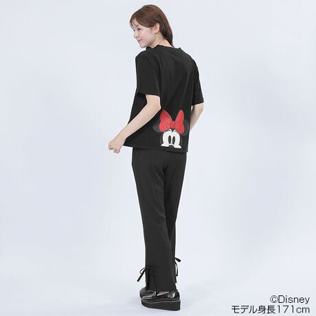 BACKの裾からミッキーマウスorミニーマウスがのぞくTシャツ。