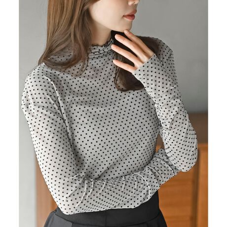 メロウ加工のハイネックが顔周りをフェミニンに。。