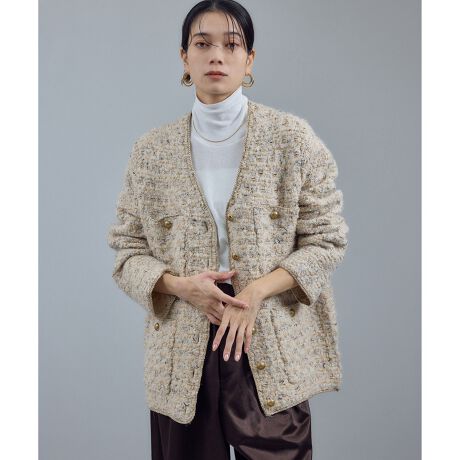 5種類の異なる糸を贅沢に使用し、まるで布帛のツイードのような立体感を表現したニット素材。