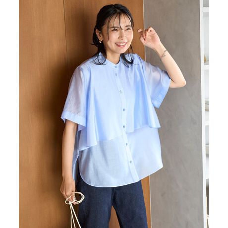■デザインラッフルのようなヨークデザインが華やかなハーフスリーブシャツ。すっきりとしたスタンドカラーとやや太めのお袖が、マニッシュな印象をプラスしてくれます。オンオフ問わず活躍する優秀アイテムです。タックイン・アウトどちらも決まるシャツテールデザイン。透け感はありながらも、秋の気分を味わえるシックなカラー展開です。