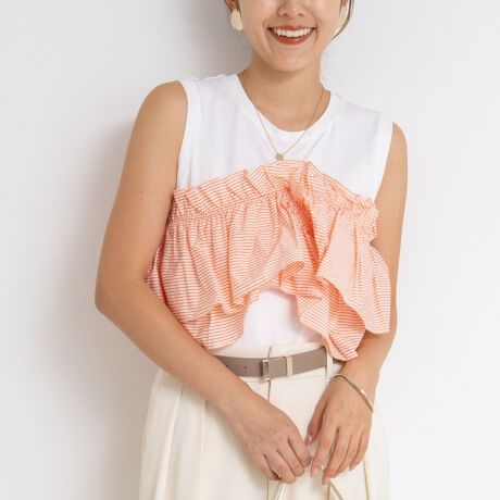 ・カラフルなストライプの素材とカットソー素材をドッキングしたマルチWAYカットソー
