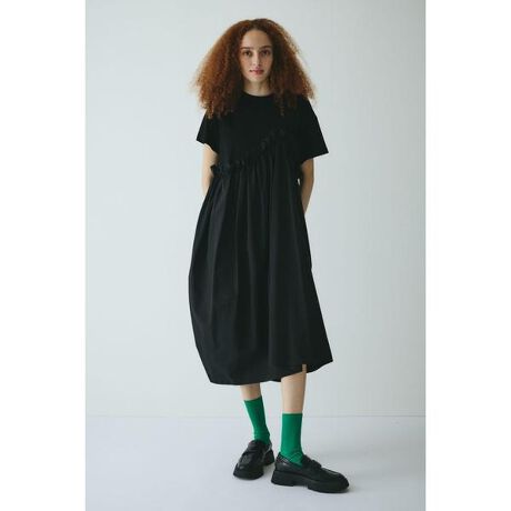カットソー素材と布帛素材をドッキングしたワンピースゆったりとしたシルエットで、下の布帛部分はコクーンのようになっています。ウエスト部分のたっぷりギャザーをよせたフリルが目をひくアイテムです。ウェーブフリルカットドレス[注意事項] ※画像の商品はサンプルです。実際の商品と仕様、加工が若干異なる場合があります。 ※画像の商品は光の照射や角度、お使いのモニター環境により、実物と色味が異なる場合がございます。 ※着用、お取り扱いの際は、アテンションタグをご確認ください。