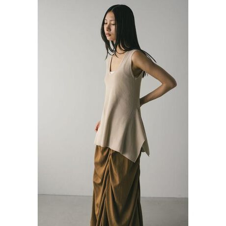 [型番:500IAT70-3251]モデル身長172cm(FREEサイズ着用)アシンメトリーなヘムカッティングがポイントのニットトップ。大きく開いたネックラインでデコルテもきれいに見せてくれます。強撚糸を使用した軽く張り感のあるドライタッチな素材を使用。フロント部分にフレアーがたまり、後ろはあえてすっきりとした見えるようなデザインに仕上げています。ストレッチあり、透け感なし。【お手入れ方法】手洗い可