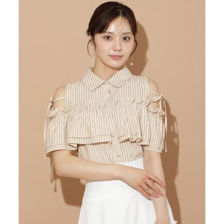 フリルとパールで甘さ添えた、きちんと見えストライプ柄ブラウス。【Design】・シャツのきちんと感に、フリルやリボンの甘さをほどよく効かせた、大人フェミニンなブラウス。・ショルダーには華奢なリボンをあしらい、コーディネートのアクセントに♪・リボンは縫い付け仕様なので取り外しの心配なく、可愛さをキープ◎・サイドの袖口はゴム仕様になっており、程よくフィットする快適な着心地に仕上げました。・フロントには上品なパールボタンをあしらい、顔まわりに華やかさを演出。・スカート合わせで上品に、デニム合わせでこなれ感のあるスタイルにも、着回し力の高い一枚です。【Fabric】・軽やかでさらりとしたポリエステル素材を使用。・ご自宅でお手入れが出来るのも嬉しいポイント♪・ホワイト、ベージュ、ブルー、ブラックの4色展開となります。【Care】手洗い可能