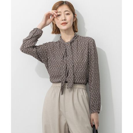 前後着用可能なモダンな雰囲気のボウタイブラウスです。様々なボトムと相性がよく、デイリーからお仕事スタイルまで幅広いシーンで活躍します。1枚ではもちろん、ジャケットのインナーとしても映えます。カラーはブラック(#505)とダークブラウン(#035)の2色展開です。