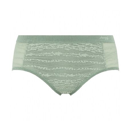 幾何学模様のボーダーレースを使用したモダンなはきこみ浅め、軽い着けごこちのヒップスタースタイルです。