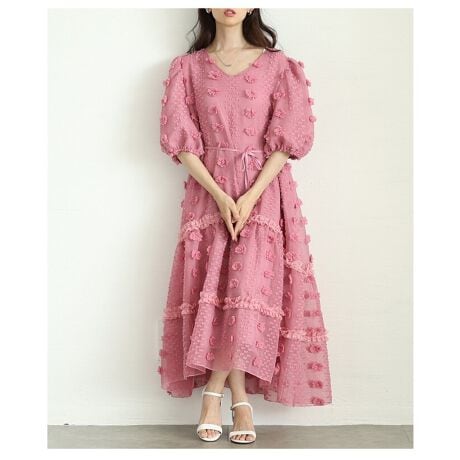 繊細な立体フラワーモチーフと軽やかなティアードデザインが魅力のロマンティックなワンピース。着る人の心を高揚させ、特別な存在感を放つ一枚です。全体に散りばめられた立体的なフラワーモチーフは、まるで小さな花々が咲き誇るよう。動くたびにふわりと揺れ、表情豊かなシルエットを演出します。ふんわりとしたティアードスカートは女性らしい優雅さを引き出し、シアー素材の透け感が軽やかな印象をプラス。すっきりとしたVネックデザインがデコルテを美しく見せ、甘さの中にシャープさを加えます。裏地付きだから一枚で安心して着用でき、取り外し可能なウエストのリボンでスタイルアップも叶い、結ばずにリラックスシルエットでも楽しめます。結婚式の二次会やパーティーなどの華やかな場から、カジュアルダウンして普段使いにも。どちらのカラーも特別な存在感を放ち、魅力を最大限に引き出します。