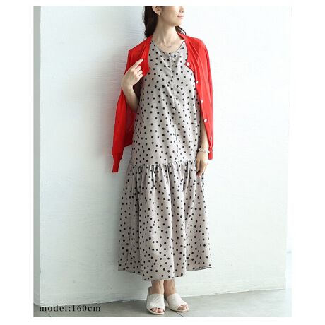 【ワンピース】 ブラック 黒 ベージュ ノースリーブ ロング丈 ドット柄 水玉 フレア ティアード