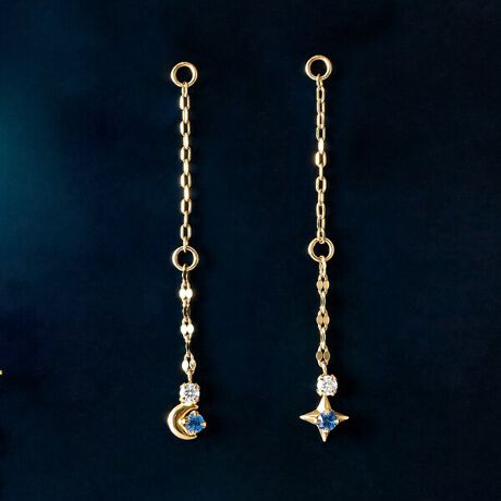 月と星のモチーフをさりげなくあしらい世界観を表現しています。ブルーサファイヤ(9月誕生石)とモアサナイトの青と白のコントラストが大人の印象です。