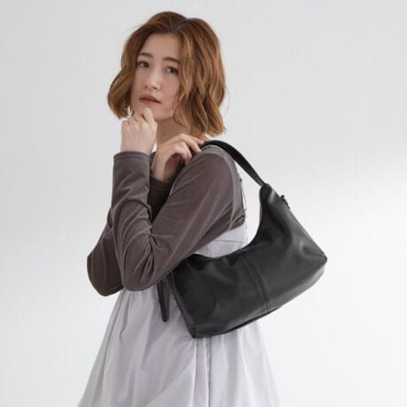 光沢感と風合いのある合成皮革を使用したワンショルダー。