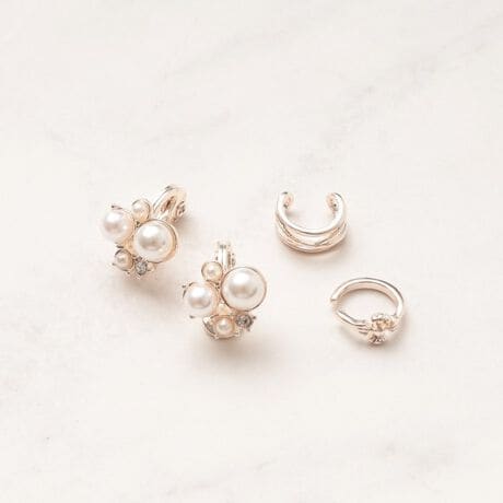 フェイクパールとビジューを組み合わせた上品なイヤリングと、使いやすいデザインのイヤーカフを組わせたセットアイテム。