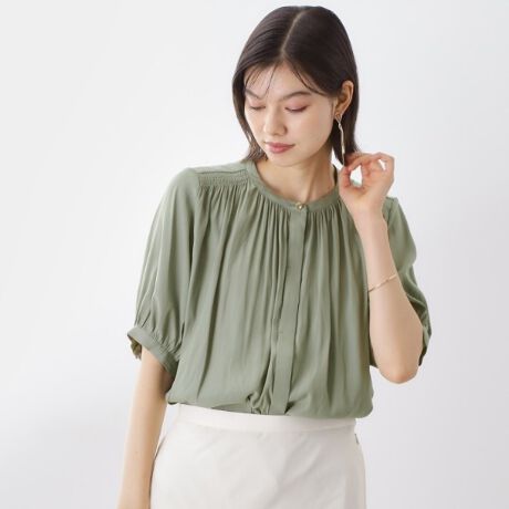 オフィスシーンにもぴったりの洗練されたデザインで、5分袖のパフリーブが女性らしさを軽やかに演出。