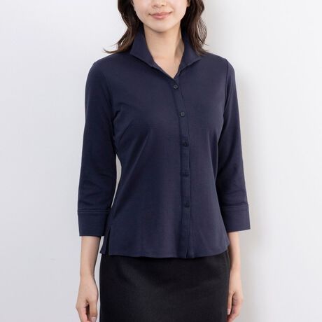 シャープな印象を与えるイタリアンスタンドカラーのトップス。ウエストにかけてシェイプしたシルエットは、美しいラインを描き女性らしさを際立たせます。手元をすっきりと見せる7分袖のデザインがポイント。トップスとして1枚で着用するのはもちろん、季節の変わり目の羽織りとしても便利なアイテム。タックインスタイルはもちろん、タックアウトもおすすめです。