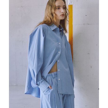 サックス...細い糸で高密度に織られたコットンストライプ素材。目の詰まったクリアな表面が特徴。