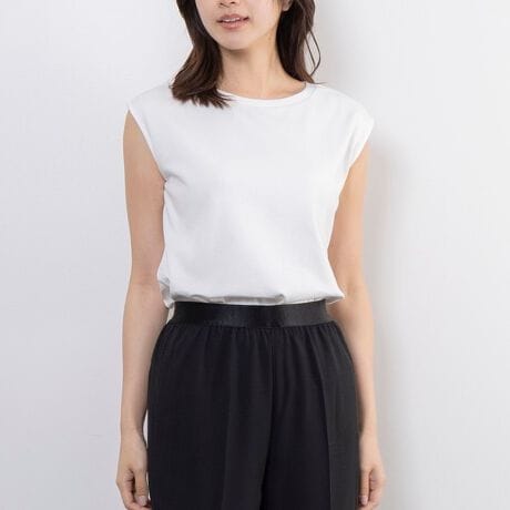 暑い時期が続く最近の秋のインナーとしても欠かせないノースリーブのカットソー。シルエットの分量やフレンチスリーブの丈にこだわり、着やすくて体型カバー効果もあるアイテムに仕上げました。コットンベースのやさしい肌触りが魅力的で、快適な着心地を実現します。さりげない抜け感を演出するサイドスリット入り。1枚で着用したり、ジャケットやシャツとのレイヤードもの楽しめるアイテムです。