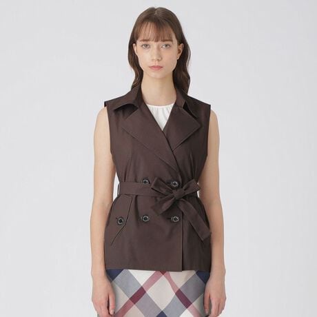 暑い時期の羽織りとして活躍するトレンチコートジレです。