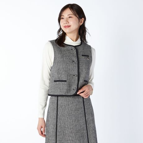 煌めくラメ糸を織り交ぜたツイード生地のベスト。配色パイピングやくるみボタンがアクセント。コンパクトなシルエットながら、袖ぐりを広めにしているため様々なトップスに合わせられます。フォーマルに着こなすのはもちろん、日常のカジュアルスタイルに取り入れるのもおすすめ。同生地のスカートと上下セットでも着用可能です。