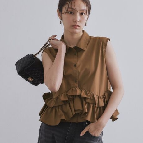 裾のラッフルフリルが華やかなノースリーブデザインシャツ