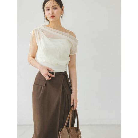 優雅なドレープデザインを取り入れたトレンド感のあるワンショルオーガンジーとニットキャミソールのドッキングトップスが完成。シアー感の美しいオーガンジーがドレープラインを描きながらふんわりとボディラインを包み込みます。ワンショルで仕上げて適度な抜け感をプラスしました。右肩の細リボンがワンポイントに。ドッキングされたフィット感のあるニットキャミは伸縮性があり、被りで着脱できるので楽ちんです。キレイめパンツに合わせてドレッシーに、カジュアルデニムのクラスアップアイテムとして、癖なく様々なボトムスと合わせやすく、コーデの幅が広がります。