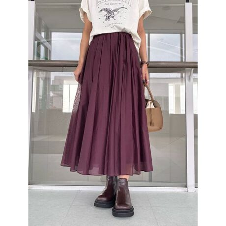 軽くて程よい透け感と艶感のある素材を使用。タックとプレスによって、ふんわりと絶妙なバランスになっています。裏地もついていて脚さばきもよく安心。