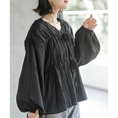 シャーリングとリボンがガーリーな雰囲気を醸し出すトップス。