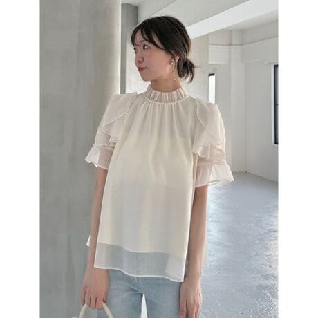 毎年SNIDELで大人気の軽やかなオーガンシースルーブラウスを今季らしくアップデート。ふんわりと透け感・艶感のあるオーガーンジー素材を使用し、高級感のあるデザインが魅力です。ブラウンはレース柄プリントを施して新鮮な表情に。フリル襟でエレガントな印象です。袖にはふんわり大きめなフリルをたっぷり入れてフェミニンながらもほどよくモード感をプラス。少し長めの丈感ですっきりとしたシルエットでお作りしているブラウスは、アウトスタイルはもちろん、タックインスタイルでも使いやすいく仕上げています。背中側襟元に涙開きで抜け感を加え、ボタンで着脱いただけます。裏地付きです。レザータイトスカート(SWFS254261)との異素材MIXコーデがおすすめです。