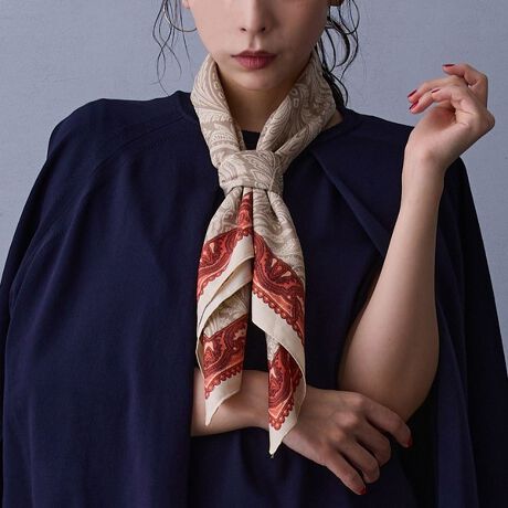 やや大判のペイズリー柄スカーフは、首回りのアクセントはもちろん、胸回りでしばるとベアトップ調に、腰回りにつけると巻きスカート調にと幅広く使えます◎