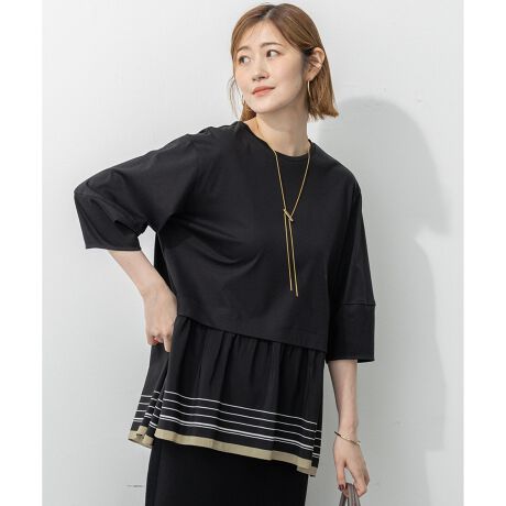 ウエストから切り替えたスカーフ柄プリントが目を惹くチュニックトップス。縁取りに色を効かせたスカーフ柄が、着こなしに華やかさを添えます。脇をハンカチーフヘムのスリットあきにすることで、歩くたびにしなやかに揺れ、軽やかで動きのある表情を演出。残暑が残る時季にも、秋のムードを先取りできるデザインです。ストレッチギャバのパンツと合わせてオフスタイルに、きれいめパンツと合わせればオンタイムにも活躍。幅広いシーンで上品な着こなしを叶えます。カラーは、やわらかな印象のアイボリー×ライトカーキ(#502)、印象引き締まるブラック×ベージュ(#505)、洗練された雰囲気のネイビー×ミッドナイトブルー(#575)の3色展開です。