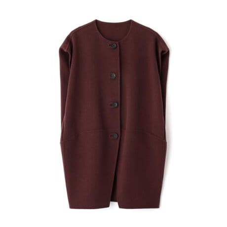 フロントは配色釦を効かせたシンプルなジレ、後ろはコクーン型にシルエットが出るよう切り替えやタックを駆使したデザイン。