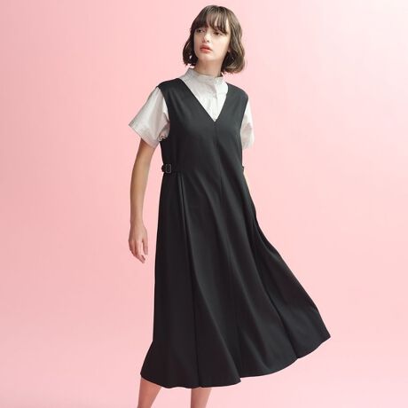 サイドベルトがポイントのジャンパースカート。両側のベルトを調整することでお好みのシルエットで着用いただけます。