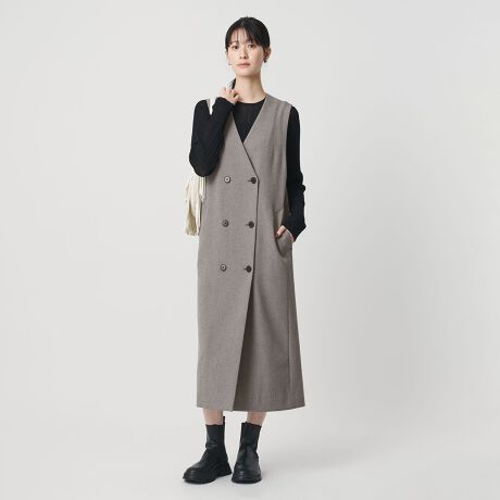 インナーもTシャツからニット、ブラウスまで好相性でジャンパースカートとして着る以外にもロングジレとしても活躍する着回し力抜群なアイテム。