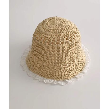 通気性の良い編みデザインとふんわりレースの組み合わせが魅力のキッズ麦わら帽子です。ナチュラルな風合いの編み込みと、帽子の縁を飾るレースが柔らかい雰囲気で、おしゃれなアクセントになります。