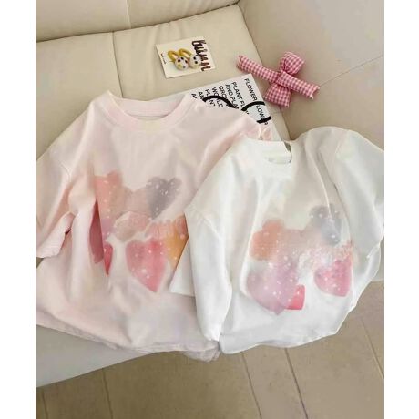 淡い色合いのハートプリントが可愛らしいTシャツ。柔らかなコットン素材で、肌触りも良く、デイリーにぴったりの1枚です。