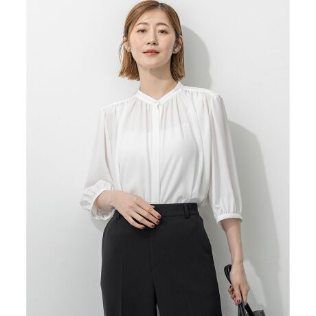 ギャザーをふんだんにあしらった、ドラマティックな表情が魅力のブラウスです。広がりすぎず、美しい落ち感が出るように計算されたギャザー分量で、上品さを保ちながら体型カバーも叶えます。ジャケットのインナーとして着用すれば、華やかさをプラスしつつきちんと感を演出。一枚で着ても存在感があり、オフィスからきれいめなお出かけまで幅広いシーンで活躍します。パンツにもスカートにも合わせやすい丈感が着回し力も抜群。カラーは、清潔感のあるホワイト(#001)、洗練された雰囲気のライトグレー(#003)、落ち着いた印象のネイビー(#075)の3色展開です。
