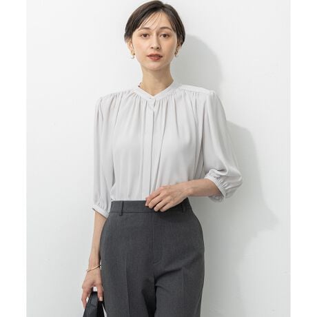 ギャザーをふんだんにあしらった、ドラマティックな表情が魅力のブラウスです。広がりすぎず、美しい落ち感が出るように計算されたギャザー分量で、上品さを保ちながら体型カバーも叶えます。ジャケットのインナーとして着用すれば、華やかさをプラスしつつきちんと感を演出。一枚で着ても存在感があり、オフィスからきれいめなお出かけまで幅広いシーンで活躍します。パンツにもスカートにも合わせやすい丈感が着回し力も抜群。カラーは、清潔感のあるホワイト(#001)、洗練された雰囲気のライトグレー(#003)、落ち着いた印象のネイビー(#075)の3色展開です。
