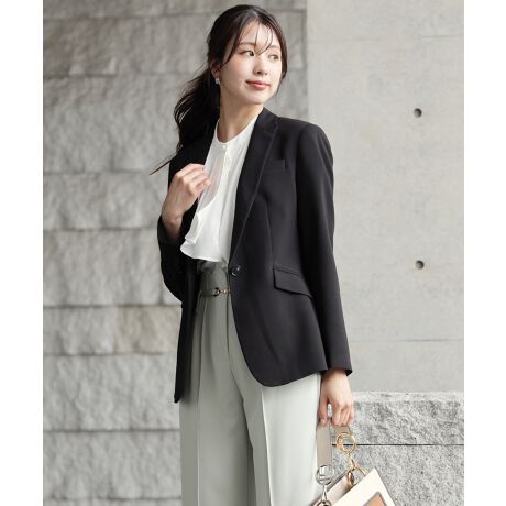 いつの時代も使えるブラックスーツ。ひとつボタンのシングルタイプで、女性らしさもあります。少々丈が長めのジャケットで細みのラインに見せながらヒップ周りのカバーもしてくれます。