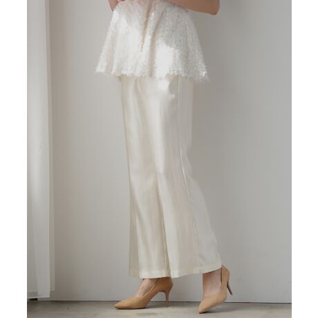 マットな光沢感があるサテンの素材感が大人の女性を演出する一枚。ややハイウエスト仕様で、美脚シルエットもキープ。落ち感のあるストレートのラインで、着痩せも叶うシルエットです。オフィスと日常使いどちらでも万能に着回せます。