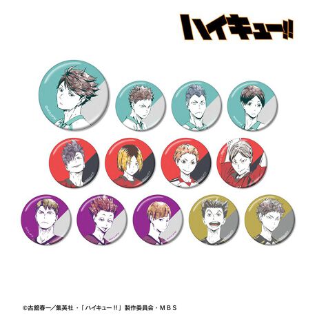 及川徹、岩泉一、金田一勇太郎、国見英、黒尾鉄朗、孤爪研磨、夜久衛輔、灰羽リエーフ、牛島若利、天童覚、白布賢二郎、木兎光太郎、赤葦京治のビジュアルを新たなタッチで魅力的に表現し、メタリック仕様の缶バッジに仕上げました。