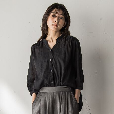 ほんのり透けてさらさらタッチの楊柳素材が涼しげな、バンドカラーの7分袖シャツ。