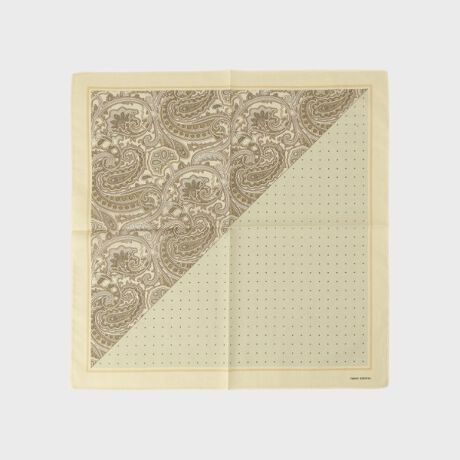 [型番:07004916]【デザインポイント】ペイズリー・ドットとトラディショナルな柄を斜めに切り替えた遊び心あるデザインのプリントハンカチ。柔らかいタッチでネッカチーフとしても使えるサイズ。※照明の関係により、実際よりも色味が違って見える場合があります。また、パソコン・スマートフォンなどの環境により、若干製品と画像のカラーが異なる場合もございます。