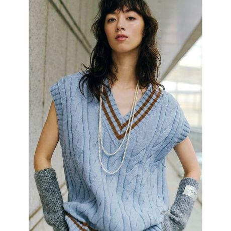 <b>【プレッピーなチルデンニットが新鮮。秋口からレイヤードスタイルに取り入れやすい、ベスト型でデザイン】</b>