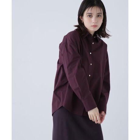 バックスタイルに拘ったフォルムシャツ。シンプルなベーシックシャツに抜け感がでるようタックを入れて、よりフォルム感のあるシルエットに仕上げています。華奢なデザインのボタンをゴールドカラーで効かせて大人女子なアイテムに。ゆったりとしたサイズ感で抜け感のあるコーディネートが叶います。秋らしいベージュとバーガンディに加えて、鮮度を上げた今年らしいストライプカラーもおすすめです。<素材>シャツらしいハリ感のあるブロード素材を使用しています。<詳細>仕様・前ボタン裏地・なし透け感・なし / 光沢・なし / 伸縮性・なし生地の厚さ・普通※モデルの着用画像の場合、光の当たり具合により、実際の色味と異なって見えることがございます。色味は、商品単体の画像をご参照ください。