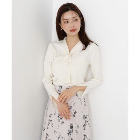 目の詰まった総針編みがきちんと見えするボウタイニットです。ボウタイに付けているリングは取り外しができ、ボウタイをひと巻きしても着られるデザイン。袖口はスリット入りときらっとパーツがさり気ないアクセントになります。