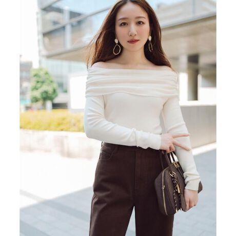 トレンドのオフショルデザインのニット。オフショル部分にギャザーを寄せており、肩を華奢見せするデザイン。コンパクトなシルエットなのでワイドパンツやフレアスカートを合わせ、デコルテをキレイに引き立てる女性らしいコーディネートがおすすめです。<素材>身頃は細いリブ編み、襟は度甘に編んだ編地でオフショルをふんわり引き立てます。ONにもOFFにも使えるプレーンな素材感です。<詳細>仕様・開閉なし裏地・なし透け感・なし / 光沢・なし / 伸縮性・あり生地の厚さ・普通 ※モデルの着用画像の場合、光の当たり具合により、実際の色味と異なって見えることがございます。色味は、商品単体の画像をご参照ください。