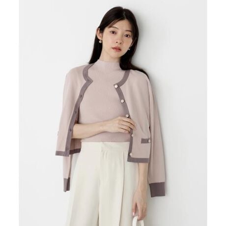 配色が目を引くニットアンサンブルです。インナーは5分袖なのでこれからの季節、長く着られるデザイン。カーディガンはゴールドカラー釦がコーディネートのポイントになります。合わせるボトムス次第で、キレイめにもカジュアルにも着回せます。