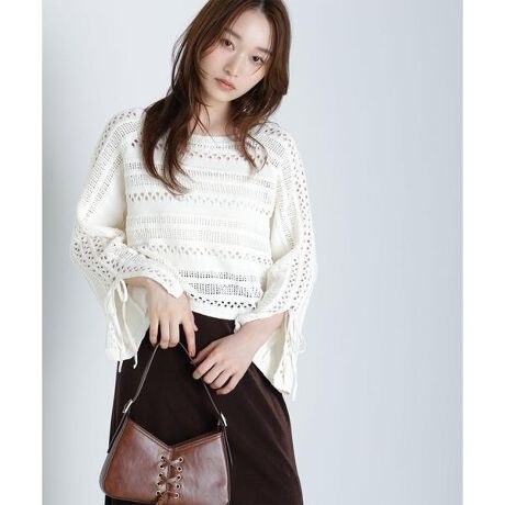 ふくらみのある糸を使用した秋にぴったりな透かし編みニット。袖口のリボンをアクセントに、スリットも入っているので動きのあるシルエットを叶えます。中にタンクトップやシアーインナーを合わせるなど、様々なレイヤードが楽しめる素材です。カジュアルな雰囲気なので、スラックスやバルーンスカートと合わせるのがおすすめです。<素材>ふんわりとしたタッチの透かし柄ニットです。<詳細>仕様・開閉なし裏地・なし透け感・ややあり / 光沢・なし / 伸縮性・あり生地の厚さ・普通※モデルの着用画像の場合、光の当たり具合により、実際の色味と異なって見えることがございます。色味は、商品単体の画像をご参照ください。