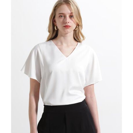 シンプルながら上品なデザインのVネックプルオーバー。カジュアルなデザインのプルオーバーを、光沢感のあるサテンを使い、オフィスでもカジュアルでも着回しのきくアイテムに仕上げました。フレアスリーブや、後身頃のゴールドボタンが、女性らしい上品さをプラス。どんなボトムスとも相性の良いプルオーバーです。