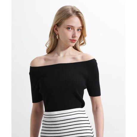 広めのデコルテ開きが特徴のニットトップス。しっかりしたテンションの細いリブ編みは着用時のフィット感がよく、ぎりぎり肩にかかるデコルテラインを下に下げてオフショルダーにしても楽しめます。程よいウエストシェイプで裾に向かって自然に体のラインに沿うデザインに。どんなボトムスとも合わせやすい1枚です。