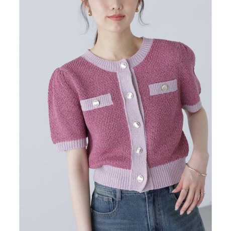 複数のカラーを引きそろえツイード調にざっくりと編み立てた、ミドルゲージの半袖カーディガン。1枚でプルオーバーとして着ていただくのがおすすめです。おさまりの良いサイジングに、ふんわりとした袖山とゴールドカラー釦がポイント。ミニスカートを取り入れたフェミニンコーデ、デニムやチノパンを取り入れるとフェミカジスタイルも楽しめます。※モデルの着用画像の場合、光の当たり具合により、実際の色味と異なって見えることがございます。色味は、商品単体の画像をご参照ください。
