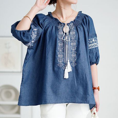 ナチュラルな抜け感と大人の可愛げを両立させる、コットンブラウスです。パフスリーブとエスニック柄、タッセル付きのリボン紐が可愛いアクセント。腰まわりをしっかり隠す着丈とふんわりシルエットがポイント。エスニック柄の縦ラインがスッキリ見えをアシスト。コットン100%で、通気性が良く肌にやさしい着心地。休日のリラックススタイルからちょっとしたお出かけや旅先の一枚としても活躍。ナチュラル派さんにぜひおすすめする一着です。